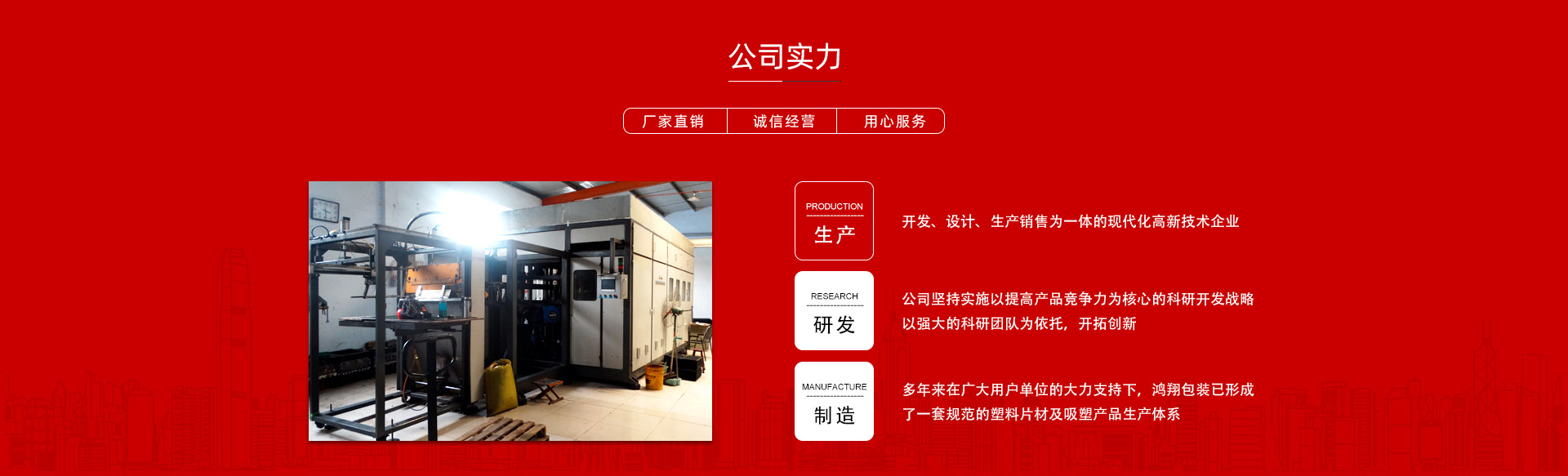 平原縣鴻翔包裝制品有限公司是一家大型生產塑料片材及吸塑產品企業,本公司投資引進電腦自動塑料氣壓成型機,壓片機,全自動高速吸塑機,率先開發生產PVC片材,PET片材,PS片材,PP片材等,鴻翔是國內先進的生產廠家之一。本公司產品廣泛應用于醫藥、食品、化妝品、日用品、農業、五金、電子元件、工藝品等行業,也可根據客戶需求自行設計制作模具。本公司技術力量雄厚,生產設備工藝先進。我們秉承用戶至上的經營宗旨,竭誠為您服務。
